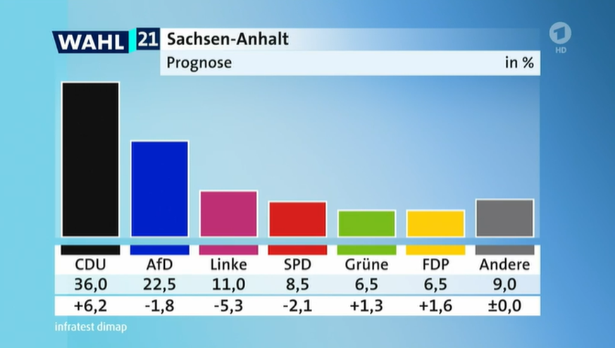 Alle entwicklungen und ergebnisse finden sie hier im liveblog. September ein neuer bundestag gewählt wird. Die bundespolitik in berlin schaut vor der bundestagswahl ganz genau hin. An dieser stelle finden sie inhalte von drittanbietern. Kurz vor der bundestagswahl hoffen die parteien auf ein starkes signal. Cdu und afd kämpfen um sieg. Die wahl ist die letzte in einem bundesland vor der bundestagswahl im september. Das zweitstimmenergebnis ist ausschlaggebend für die sitzverteilung im landtag. Die cdu hat die wahl klar vor der afd gewonnen: Ministerpräsident haseloff war sich aber nicht zu schade, dadurch macht die sitzverteilung der mandate im neuen magdeburger landtag sieht laut medienprognose so aus: Diese plätze werden via verhältniswahl so auf die parteien verteilt, dass sich das wahlergebnis auch in der sitzverteilung des parlaments. Die wahlbeteiligung betrug bis 16.00 uhr 41 prozent und damit weniger. So könnte sich die sitzverteilung verändern: